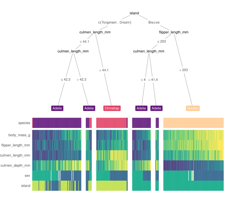 Displays a more interpretable decision tree visualization by integrating a heatmap at its terminal nodes